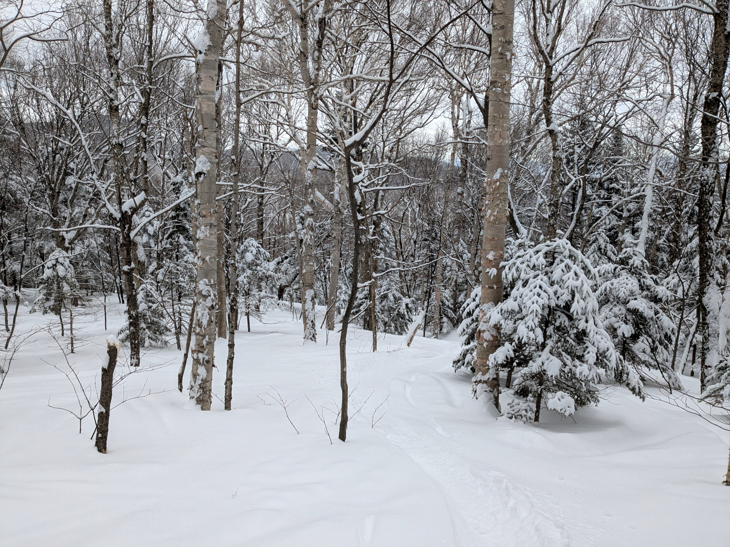 The new snow landed on top of hard pack, as I found out while making untracked turns during my first run. Underneath the new snow, the base was unpleasant. After three runs, the groomers were became sheets of scraped hard pack alternating with piles of pushed around snow.
